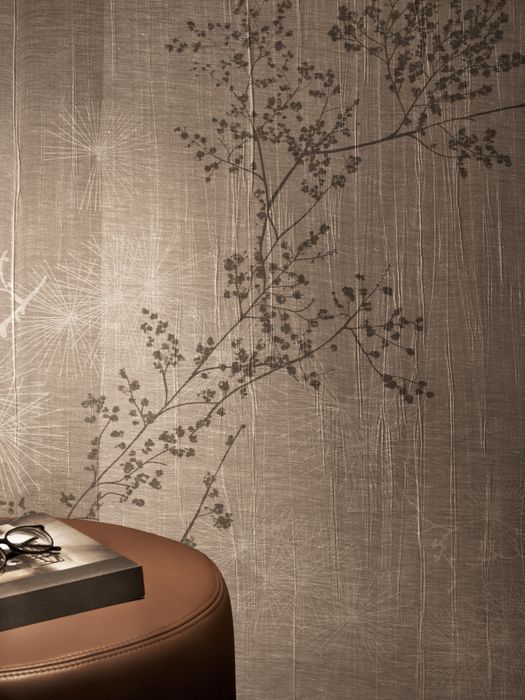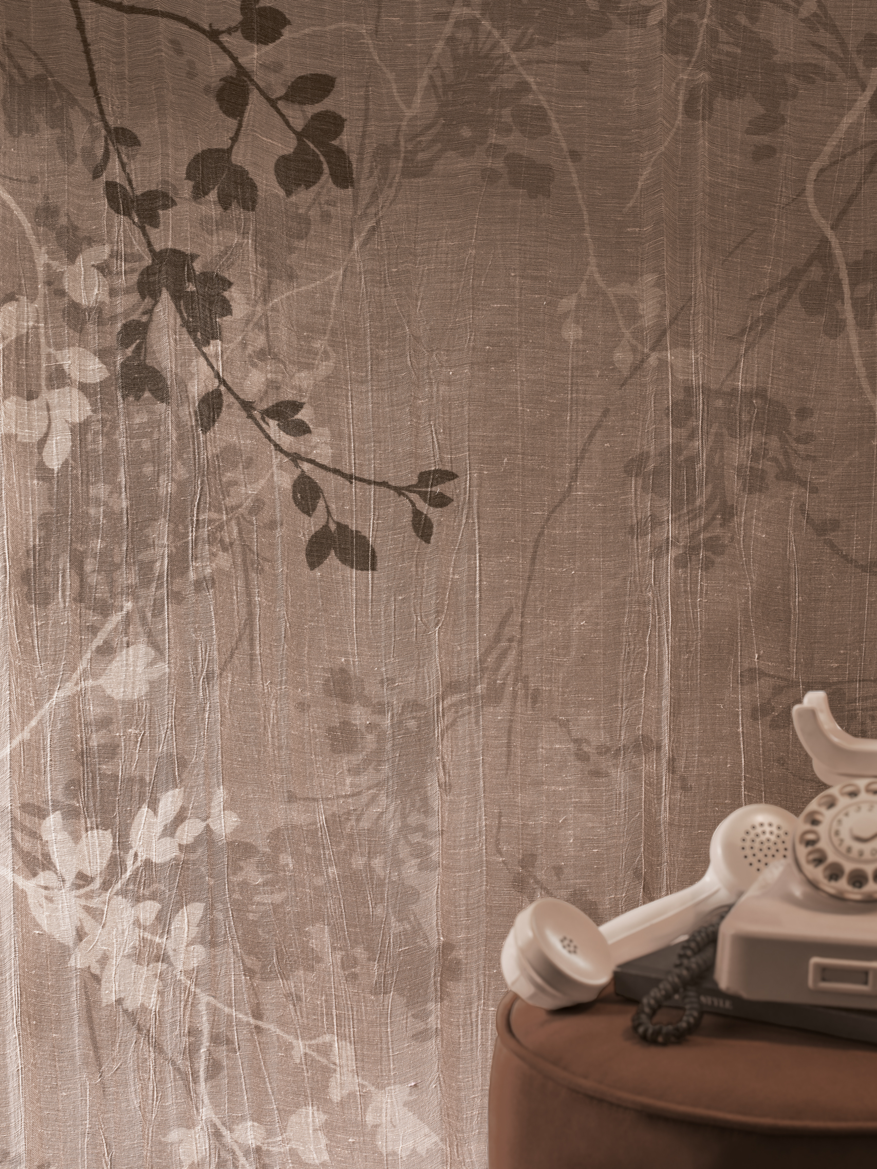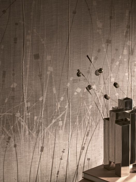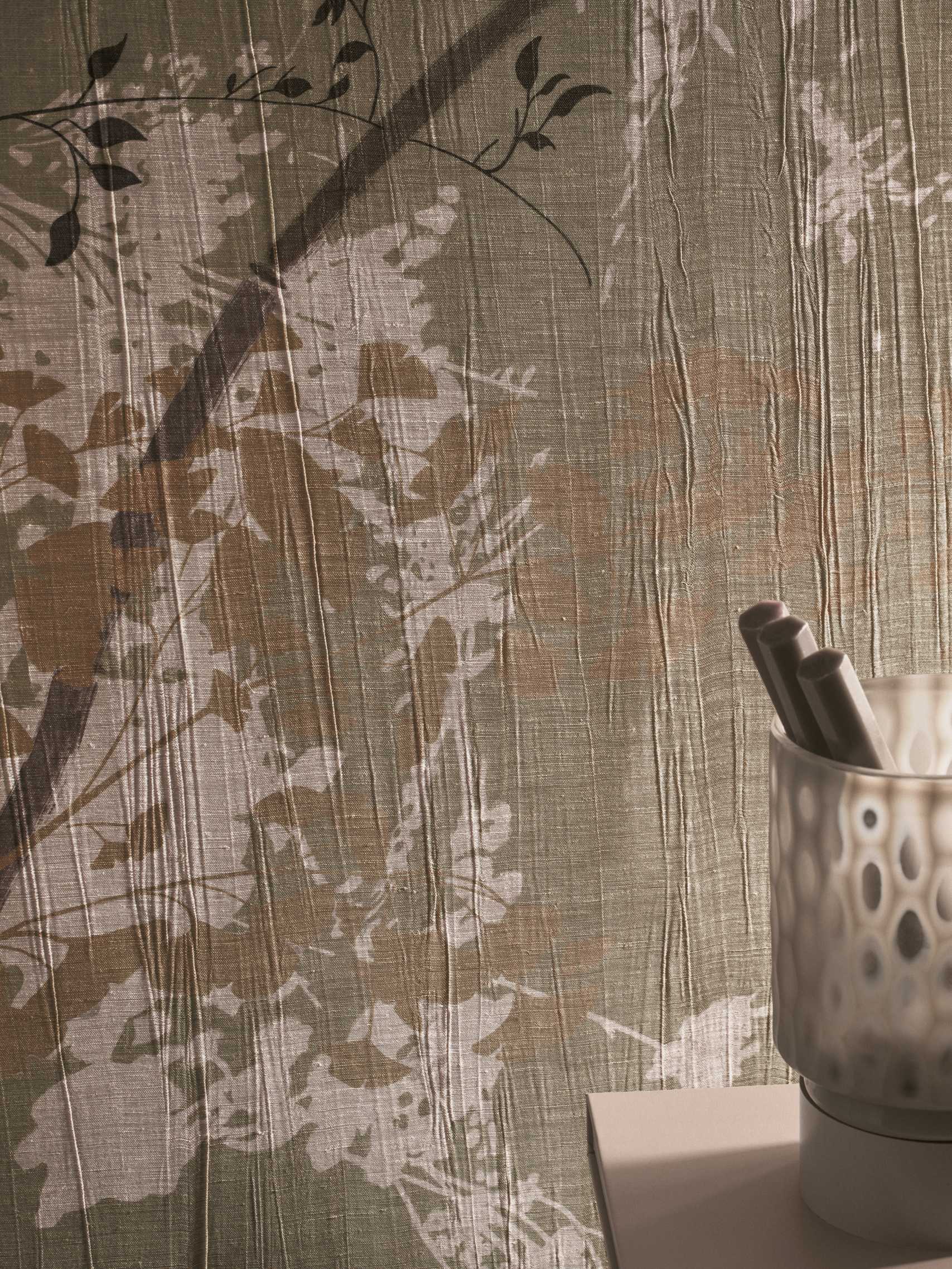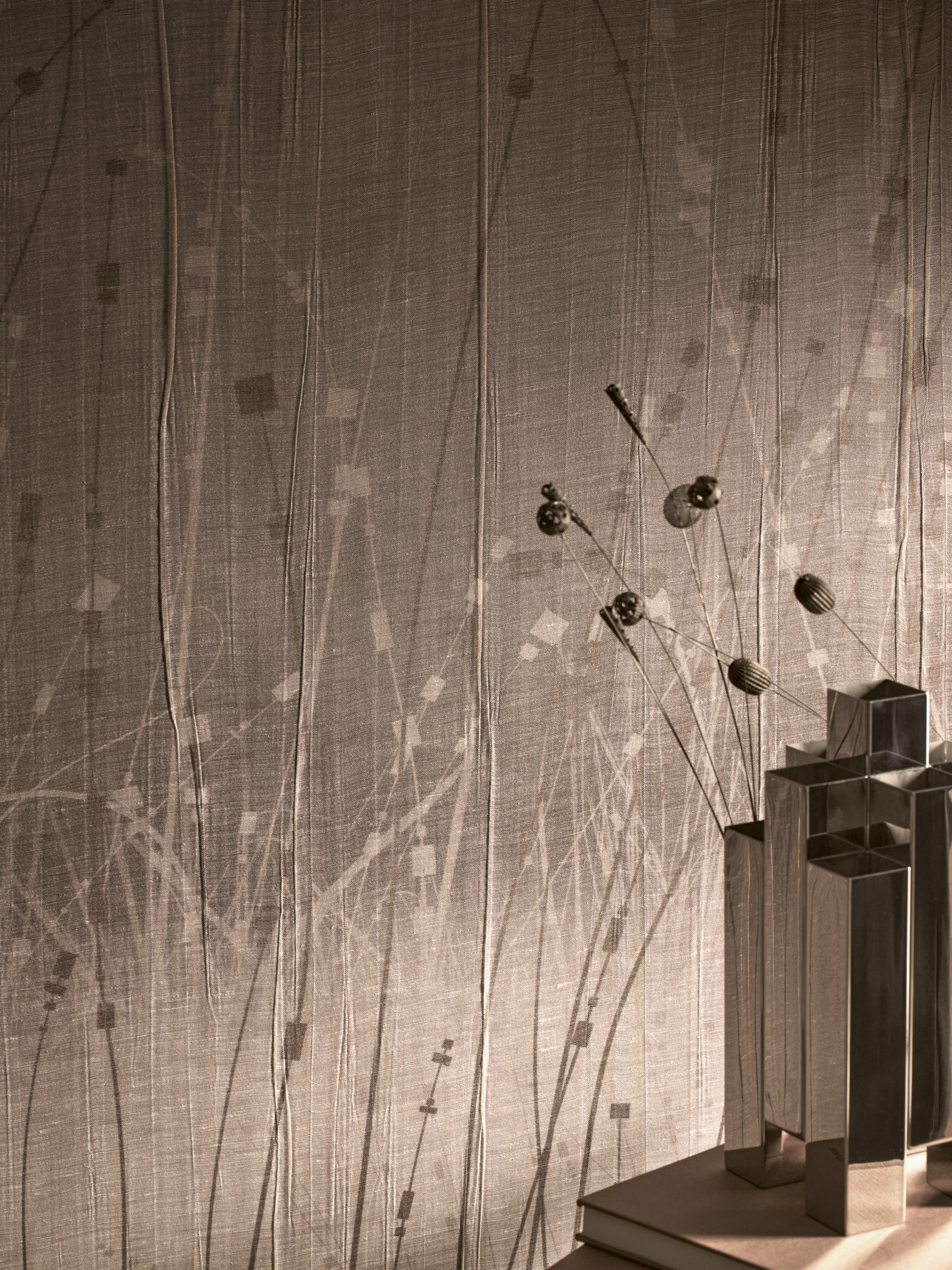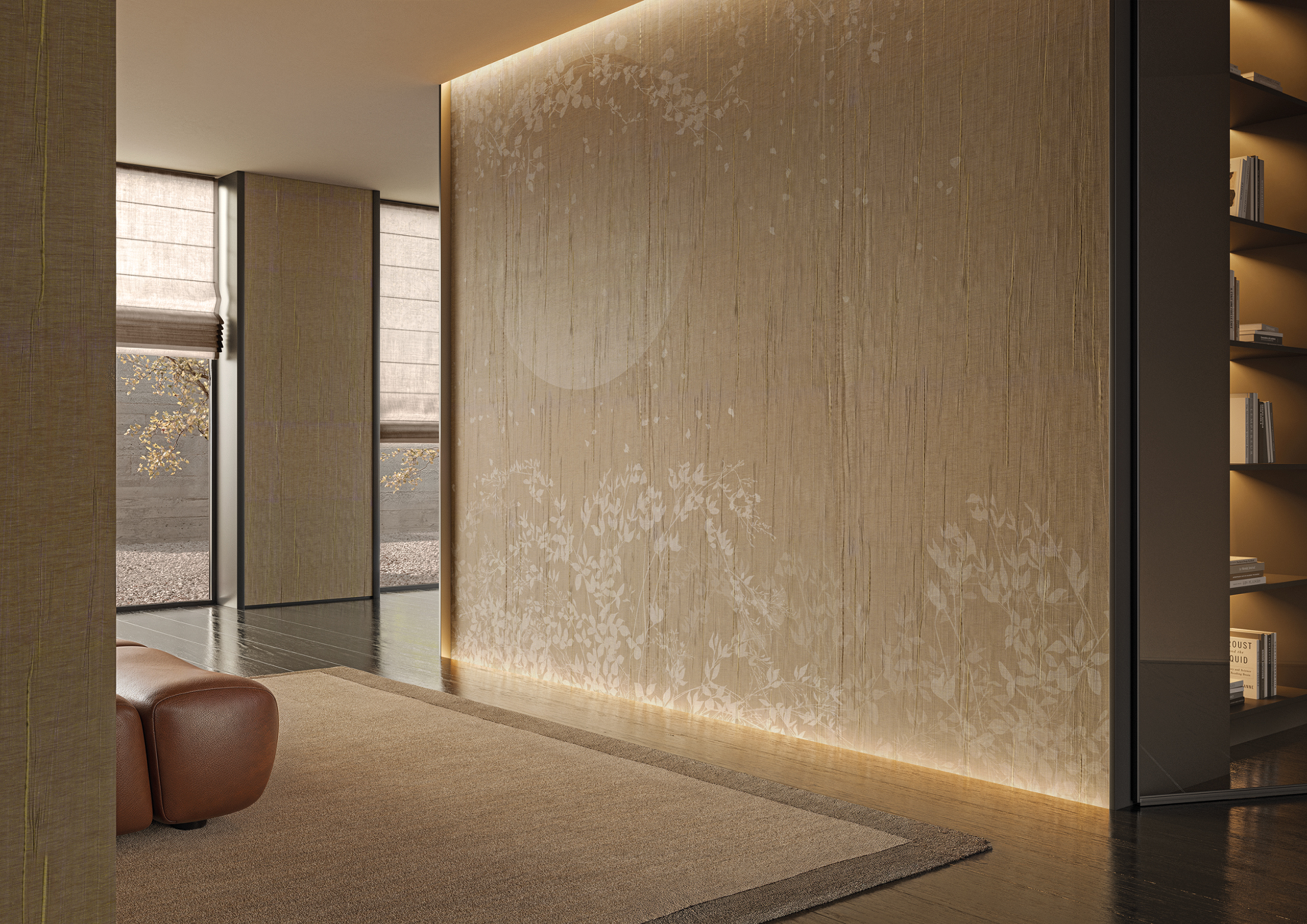 Elemento principale della collezione è GlamPlissé, un rivestimento murale tessile tridimensionale in lino puro, lavorato mediante una plissettatura verticale continua. La tridimensionalità non è un effetto applicato, ma una condizione intrinseca della superficie, che introduce un ritmo verticale irregolare e modifica la percezione della parete. La resa semi-opaca e luminosa genera un effetto di vedo / non vedo, capace di conferire profondità senza interrompere l’unità della superficie.