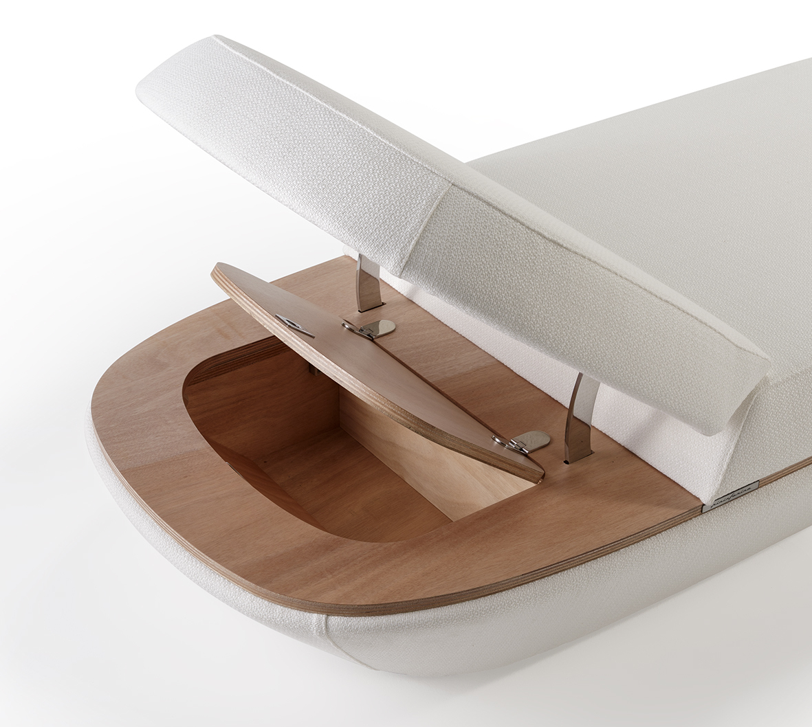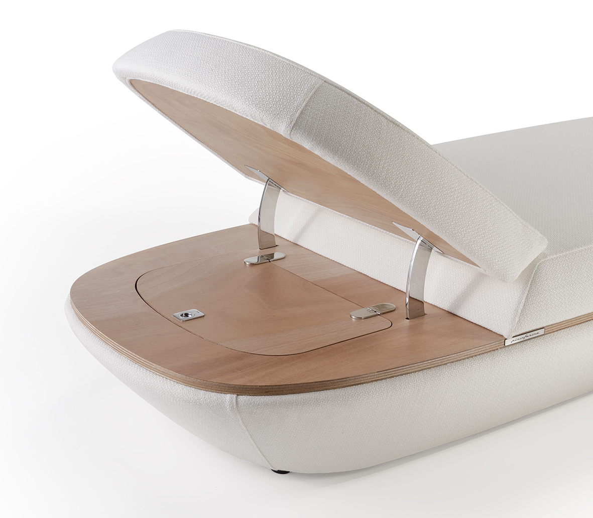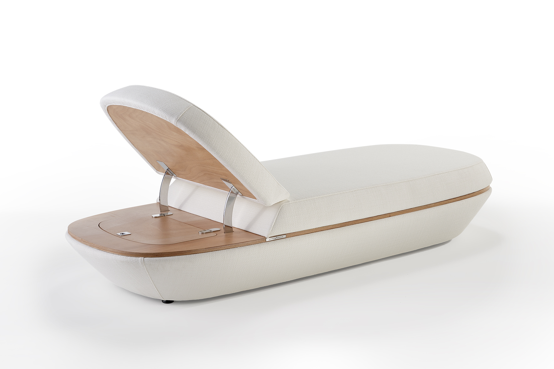 Il progetto richiama il mondo nautico, non solo per la possibilità di utilizzo su deck e yacht di grandi dimensioni, ma anche per dettagli tecnici integrati che si ispirano ai gavoni e agli spazi contenitivi tipici della barca, reinterpretati in chiave design.
