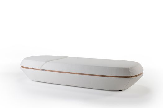 Non una citazione letterale, ma una reinterpretazione progettuale che trasferisce nel mondo dell’arredo i principi dell’aerodinamica e della ricerca volumetrica automobilistica. Grande attenzione è stata dedicata ai materiali. Il sun bed utilizza tessuti outdoor di ultima generazione, altamente performanti e resistenti agli agenti atmosferici, capaci di replicare la grana e la ricchezza visiva dei tessuti da interno. Una scelta che rafforza l’idea di continuità tra spazi indoor e outdoor, cifra distintiva della collezione Orizzonte.