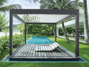 Disponibile in versione a isola o addossata, la pergola Twist consente di gestire il flusso d’aria e la luce diretta grazie alla copertura a lame orientabili