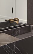 Le finiture spaziano dall'intonaco bianco al marmo naturale, in dialogo con la rubinetteria bronzo Ritmonio. Il progetto House O firmato archiSENSE studio