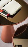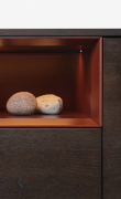 Ispirata alle sfumature cangianti del fagiolo giapponese, dal bordeaux al marrone, la nuance intensa e avvolgente si abbina ai legni scuri, ai marmi neri e al cuoio