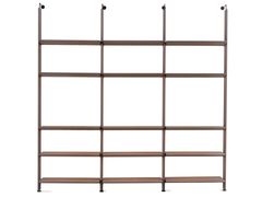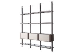 Libreria componibile a giorno in legno e vetro con fissaggio pavimento-soffitto